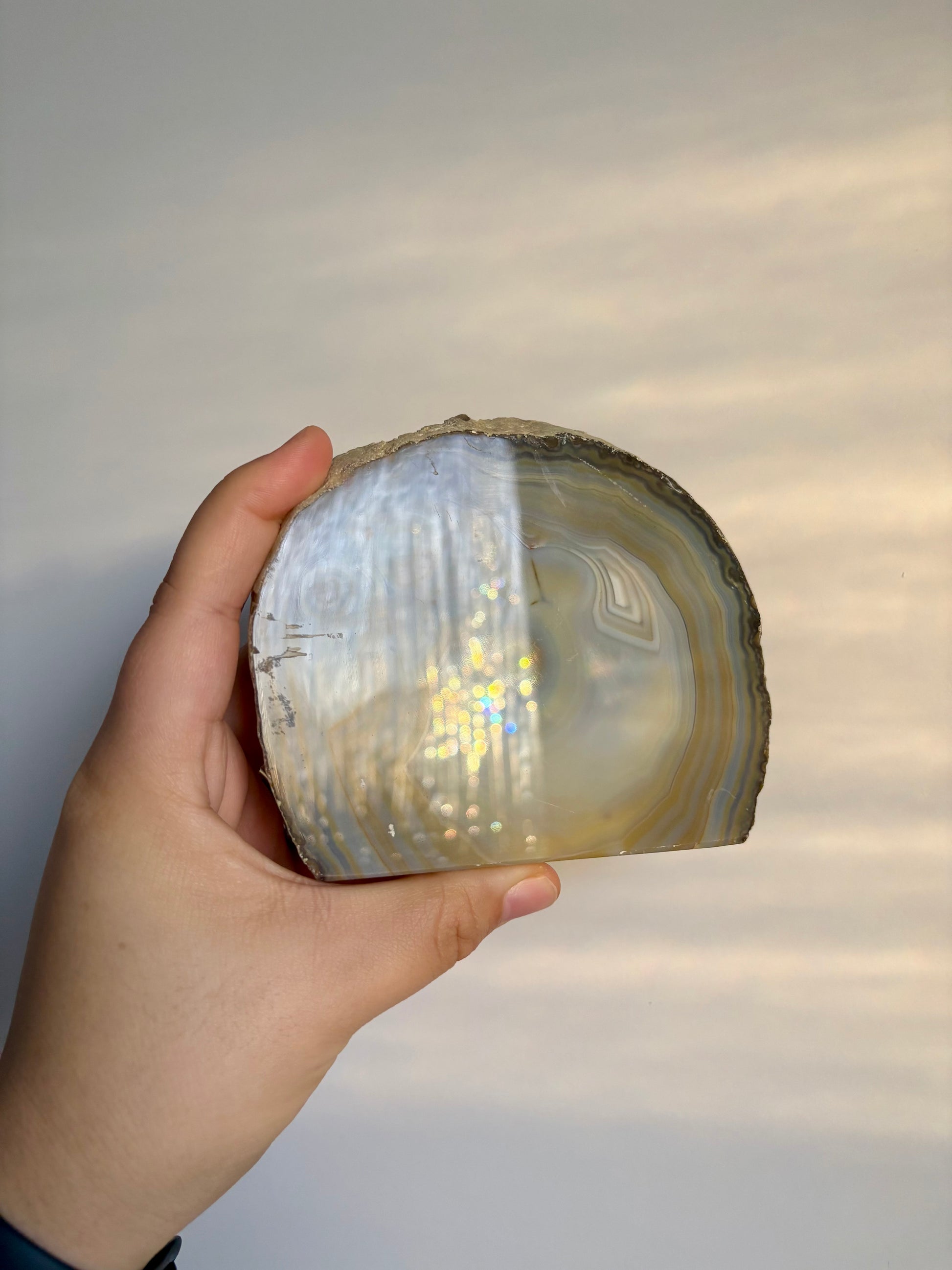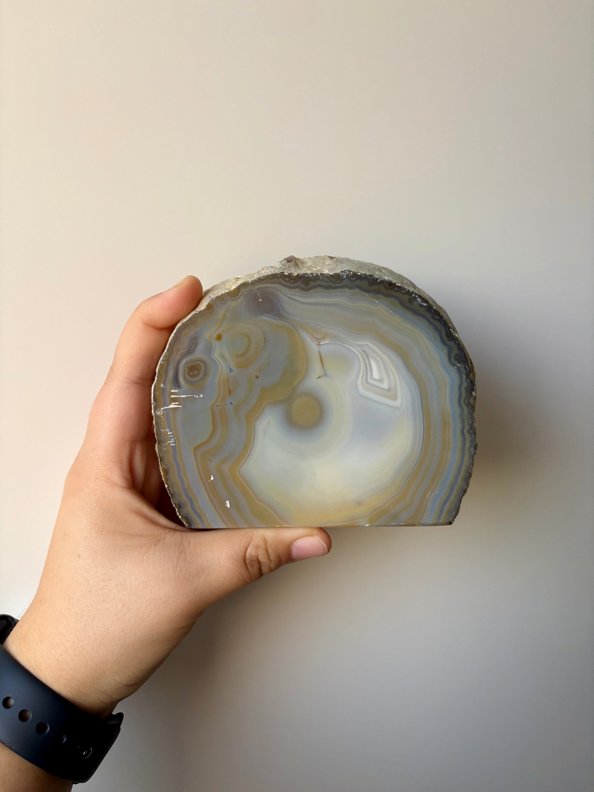 Deze Agaat staander, gekenmerkt door haar natuurlijke, gelaagde patronen, is een echte blikvanger in je interieur. Agaat wordt gezien als een steen van stabiliteit en rust, die helpt om balans en een gevoel van veiligheid te creëren. De unieke kleuren en lijnen vertellen stuk voor stuk een verhaal van de aarde, waardoor elke schijf een eigen karakter en energie heeft. Een stijlvol en betekenisvol item voor in je woon- of werkruimte.