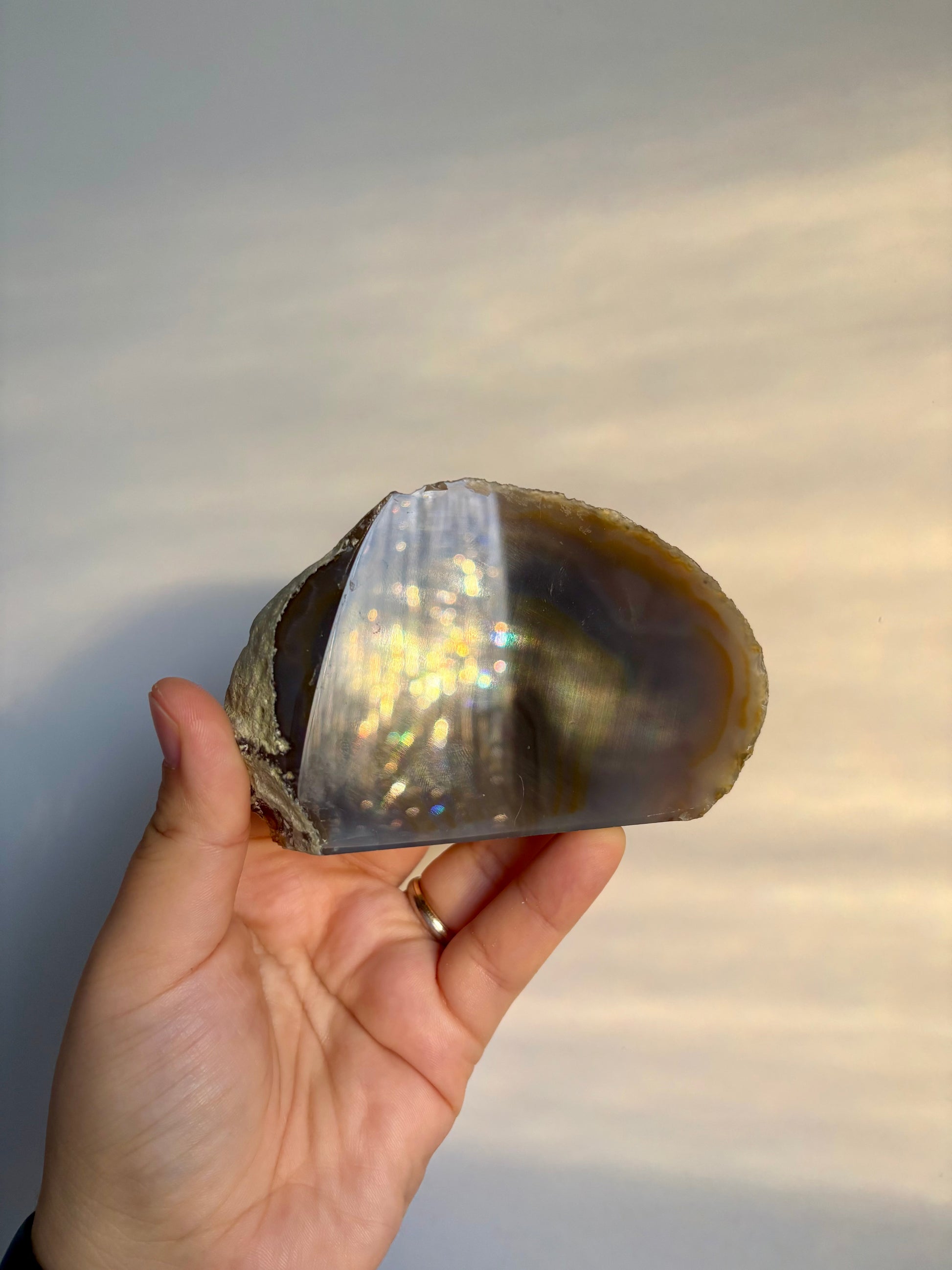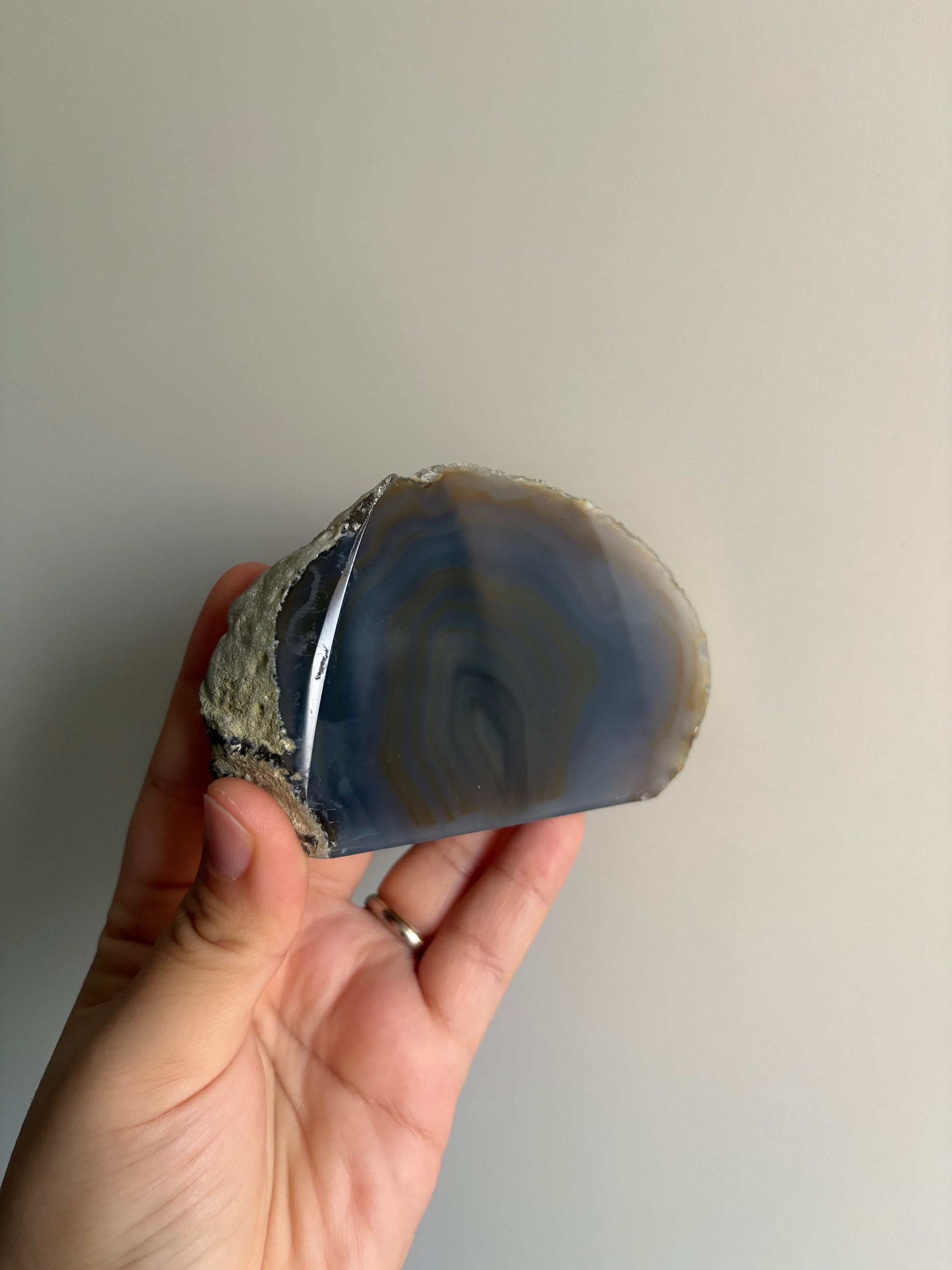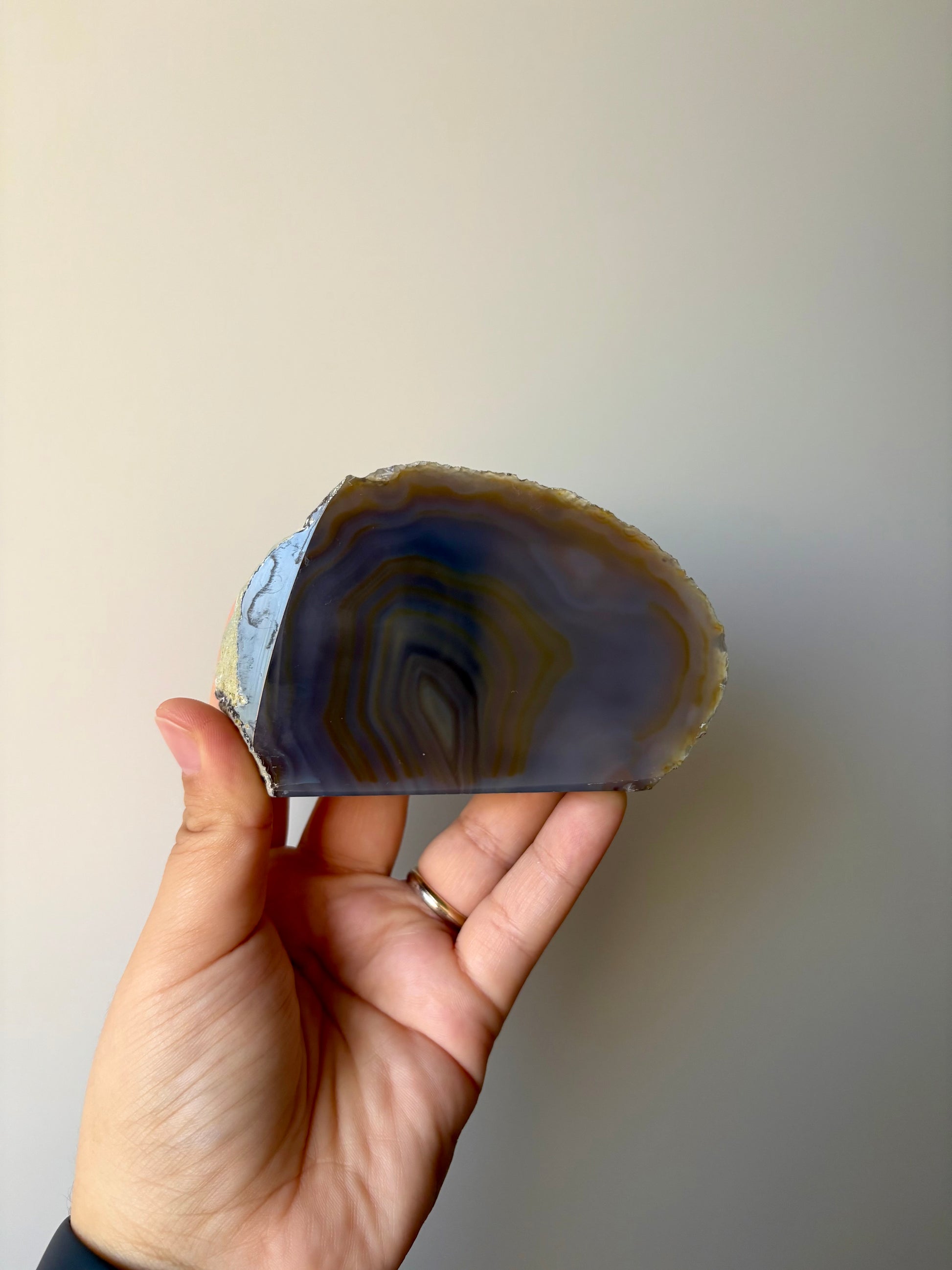 Deze Agaat staander, gekenmerkt door haar natuurlijke, gelaagde patronen, is een echte blikvanger in je interieur. Agaat wordt gezien als een steen van stabiliteit en rust, die helpt om balans en een gevoel van veiligheid te creëren. De unieke kleuren en lijnen vertellen stuk voor stuk een verhaal van de aarde, waardoor elke schijf een eigen karakter en energie heeft. Een stijlvol en betekenisvol item voor in je woon- of werkruimte.