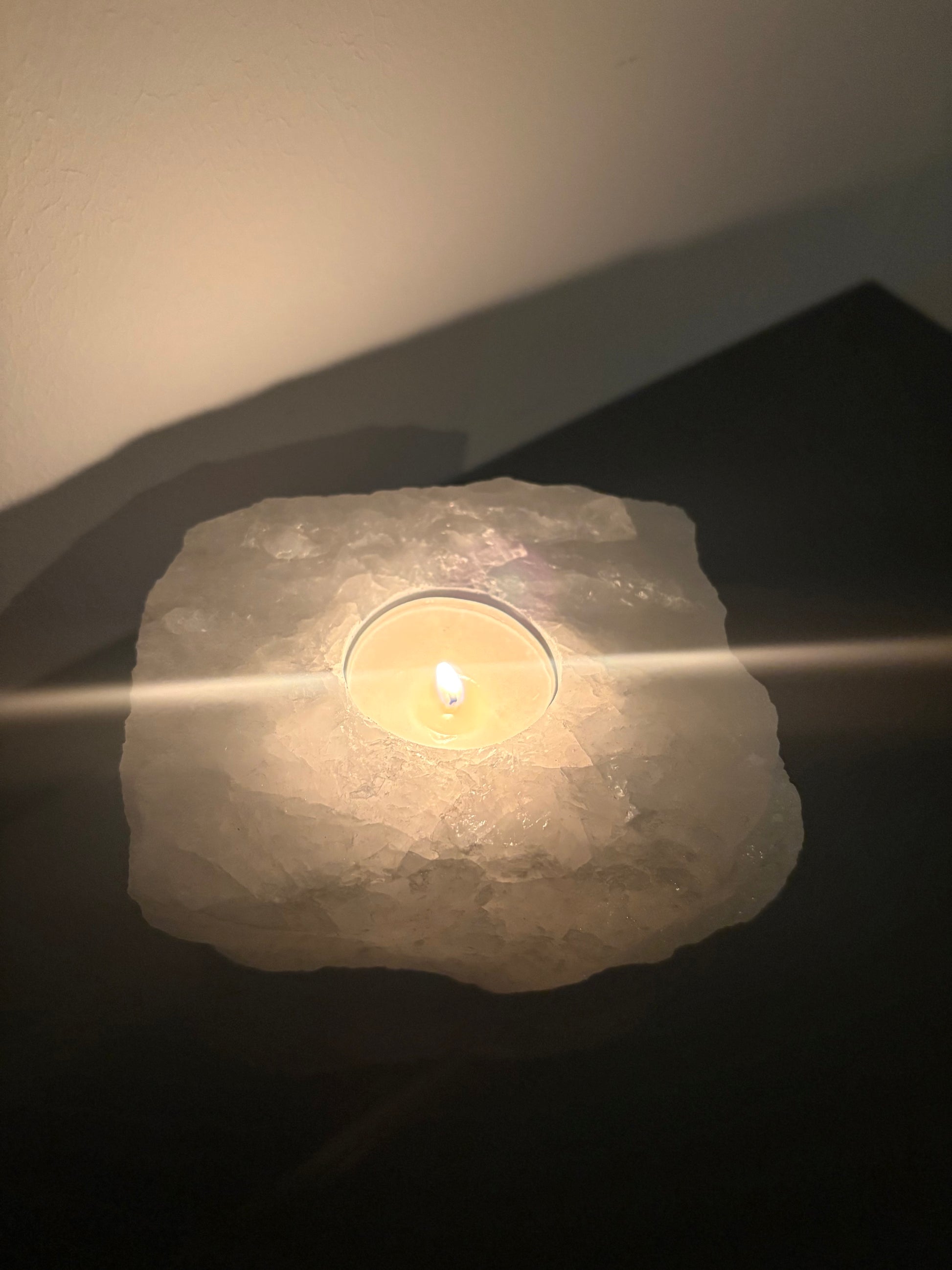 Spiritueel gezien wordt Bergkristal geassocieerd met helderheid, zuivering en positieve energie. Het brandende licht kan helpen om een harmonieuze en kalmerende sfeer te ondersteunen, ideaal voor meditatie, ontspanning of als bijzondere decoratie in huis.