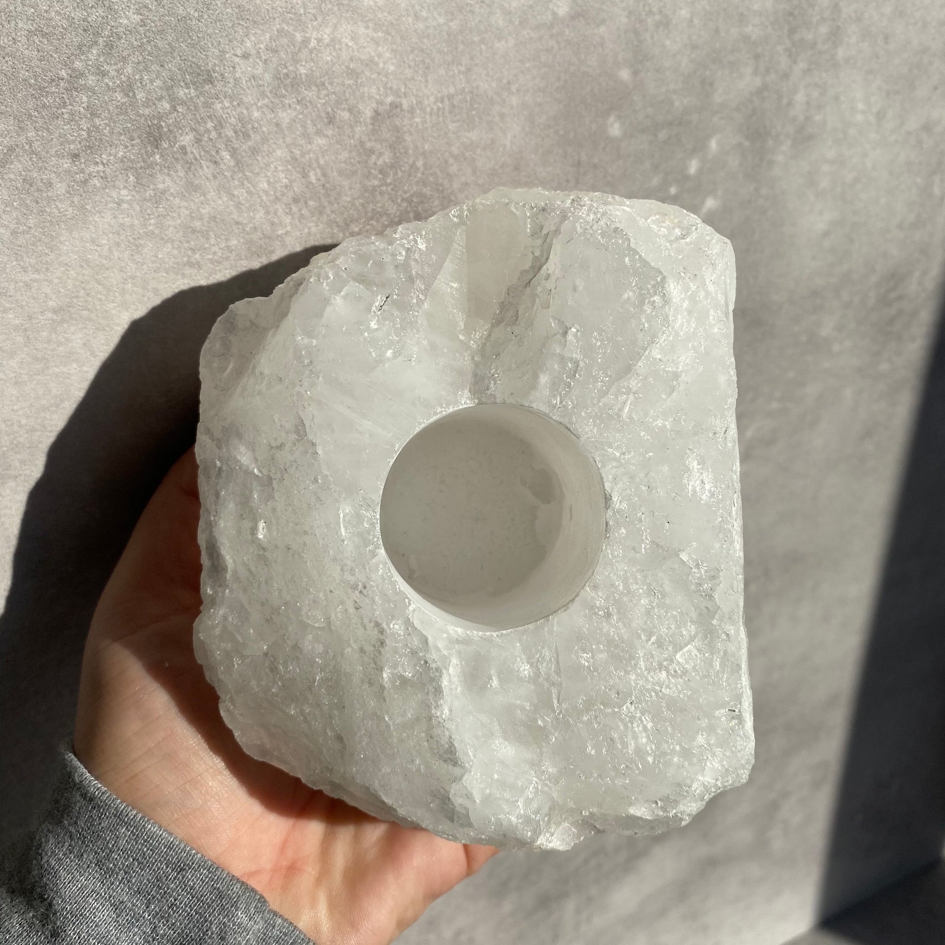 Deze prachtige Bergkristal theelichthouder, is uniek in vorm, structuur en transparantie. Wanneer het theelichtje brandt, weerspiegelt het warme licht door de kristalstructuur en creëert het een sfeervolle, rustgevende ambiance in iedere ruimte. Het betreft een natuurproduct, waardoor iedere steen uniek is.