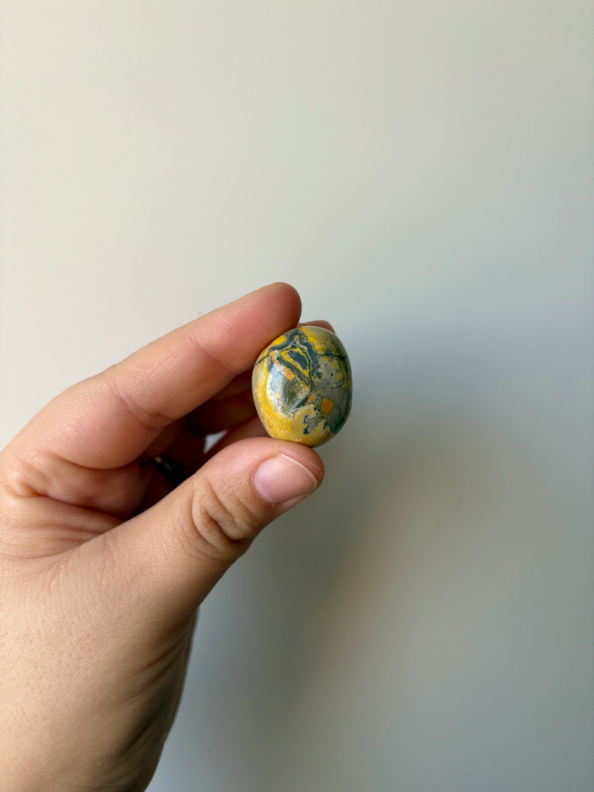 Deze Bumble Bee trommelsteen valt op door zijn levendige gele, oranje en zwarte strepen en unieke patronen. Elke steen is een natuurproduct, waardoor kleur en structuur per exemplaar verschillen. Het gladde oppervlak maakt de trommelsteen prettig om vast te houden, te bewonderen of neer te zetten als decoratief object.