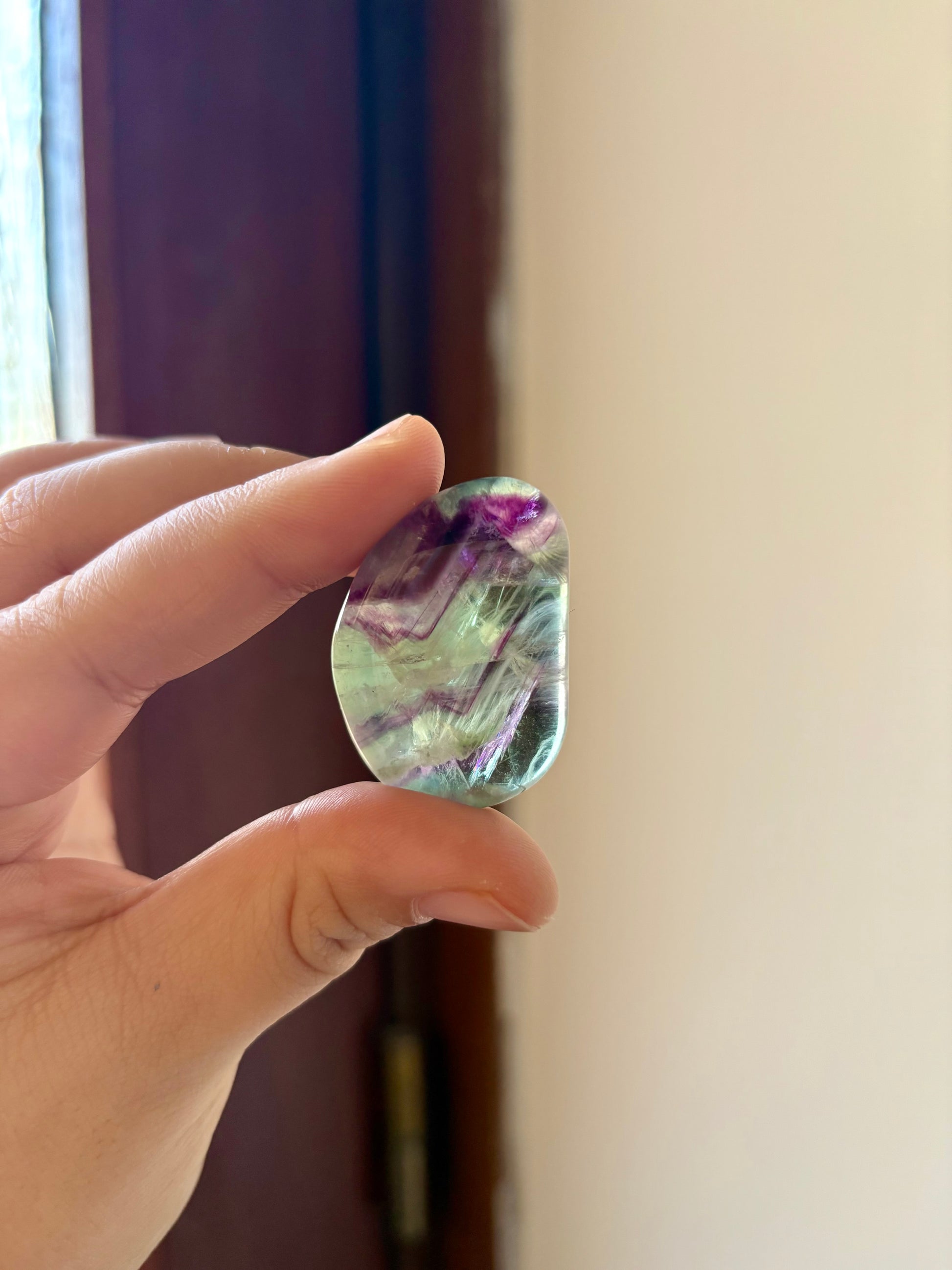 Fluoriet trommelsteen is een kleurrijke edelsteen met prachtige tinten paars, groen, soms blauw en heeft een glad, gepolijst oppervlak, waardoor hij prettig in de hand ligt. Elk exemplaar is uniek en straalt een heldere, frisse energie uit.