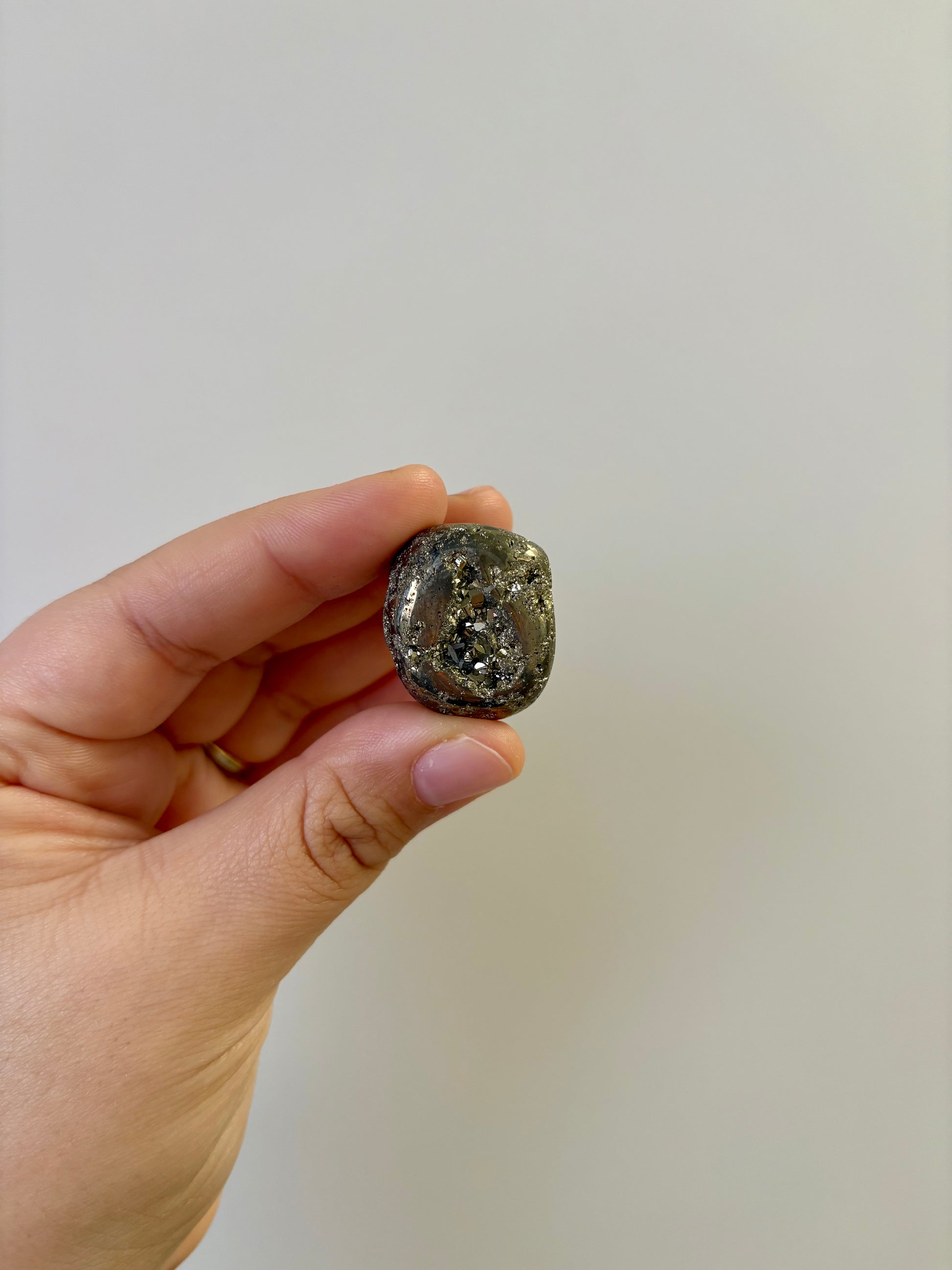 Pyriet trommelsteen is een opvallende edelsteen met een goudkleurige glans. Pyriet in trommelsteen vorm is vaak glad gepolijst met een ruwe (binnen)kant. De steen ligt prettig in de hand en straalt kracht en luxe uit. Elk exemplaar is uniek en trekt direct de aandacht.
