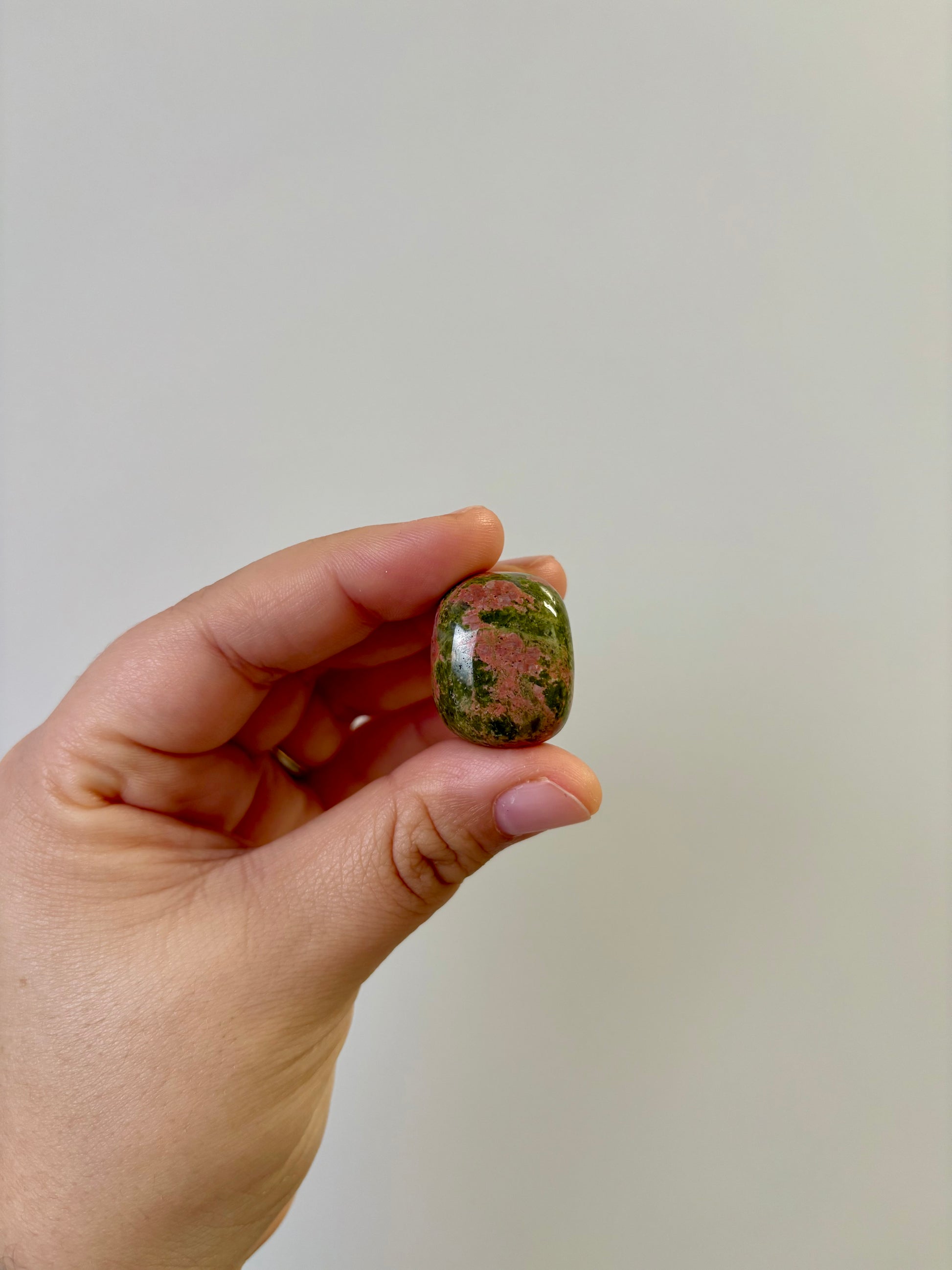 Unakiet trommelsteen is een opvallende, groen roze kristalsteen met een glad, gepolijst oppervlak, waardoor hij prettig in de hand ligt. Elk exemplaar is uniek en nodigt uit om vastgehouden en aangeraakt te worden.