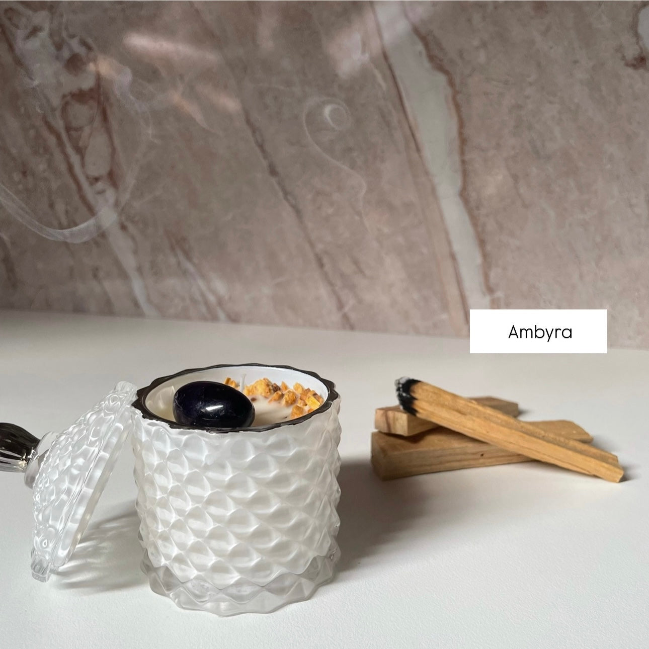 Deze heerlijk geurende kaars is gemaakt van milieuvriendelijke en duurzame sojawas, voor een schone én gezonde brandervaring. De geuren zijn samengesteld uit biologische essentiële oliën en gecombineerd met een bijpassende edelsteen. Verwijder vóór het aansteken altijd de decoratie, zoals gedroogde bloemen en de edelsteen. 100 ml / 25 branduren