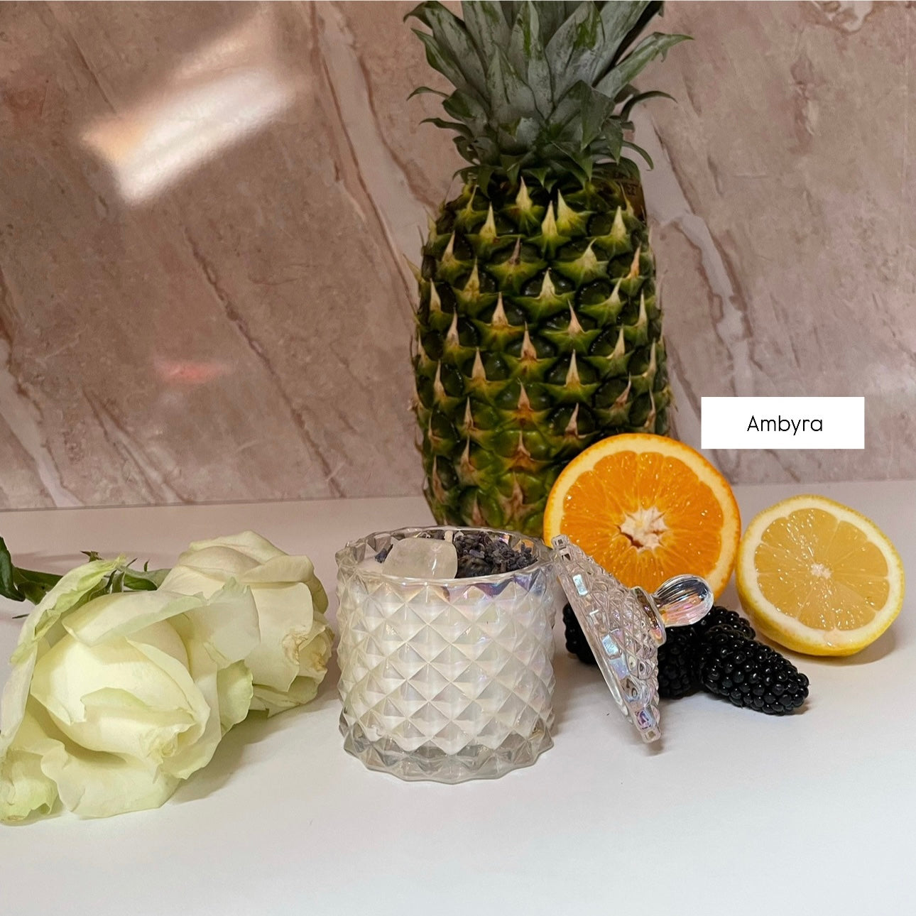 Voel de frisheid van bergamot, ananas en appel, met een subtiele bloemige mix van roos en jasmijn. Edelsteen: Witte Calciet.