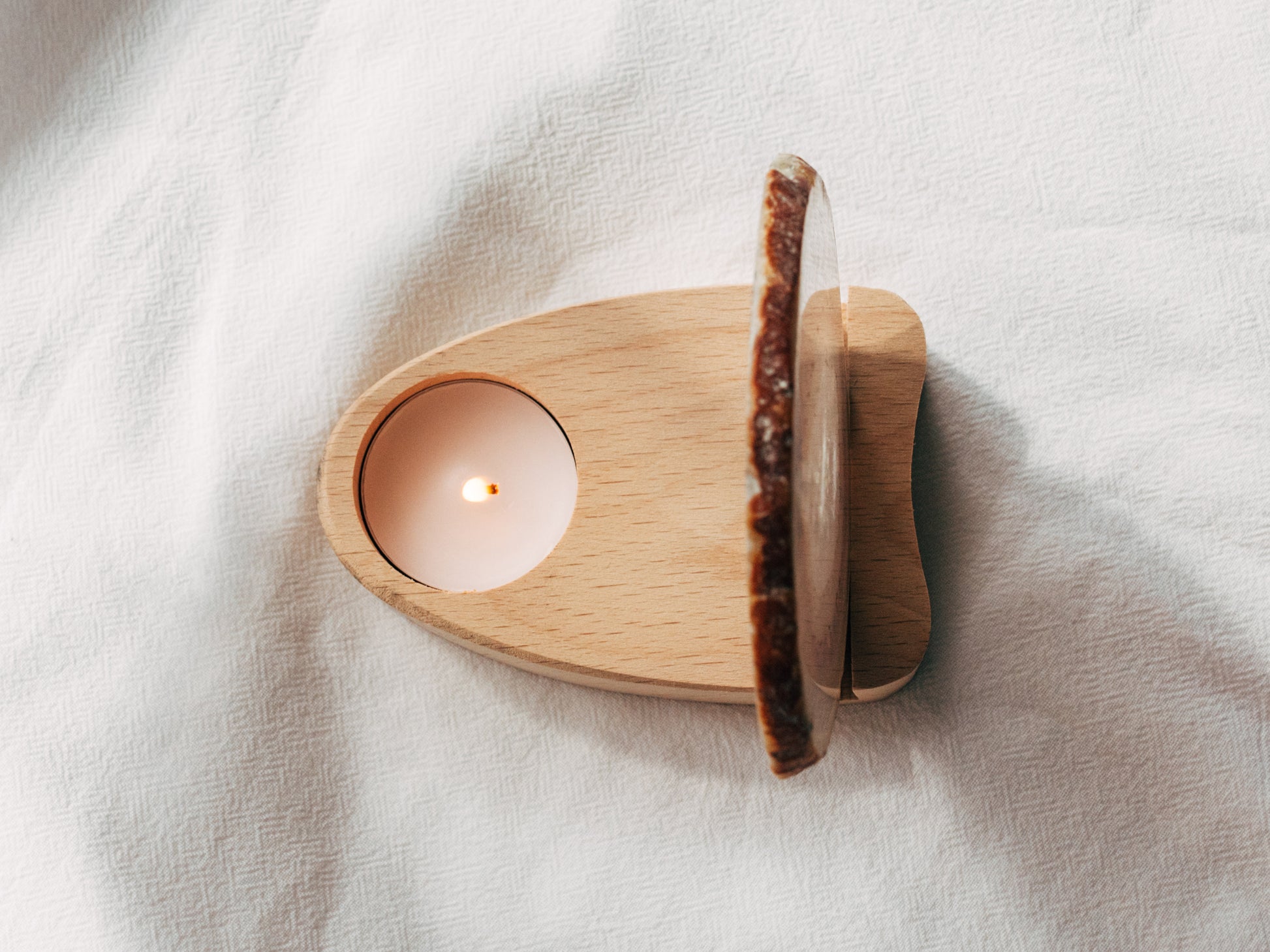 De uitsparing is speciaal ontworpen voor een Agaat schijf, zodat het licht er prachtig doorheen kan schijnen en de kleuren optimaal tot hun recht komen. Deze houten houder wordt geleverd inclusief theelichtje. Let op: agaatschijf niet inbegrepen.