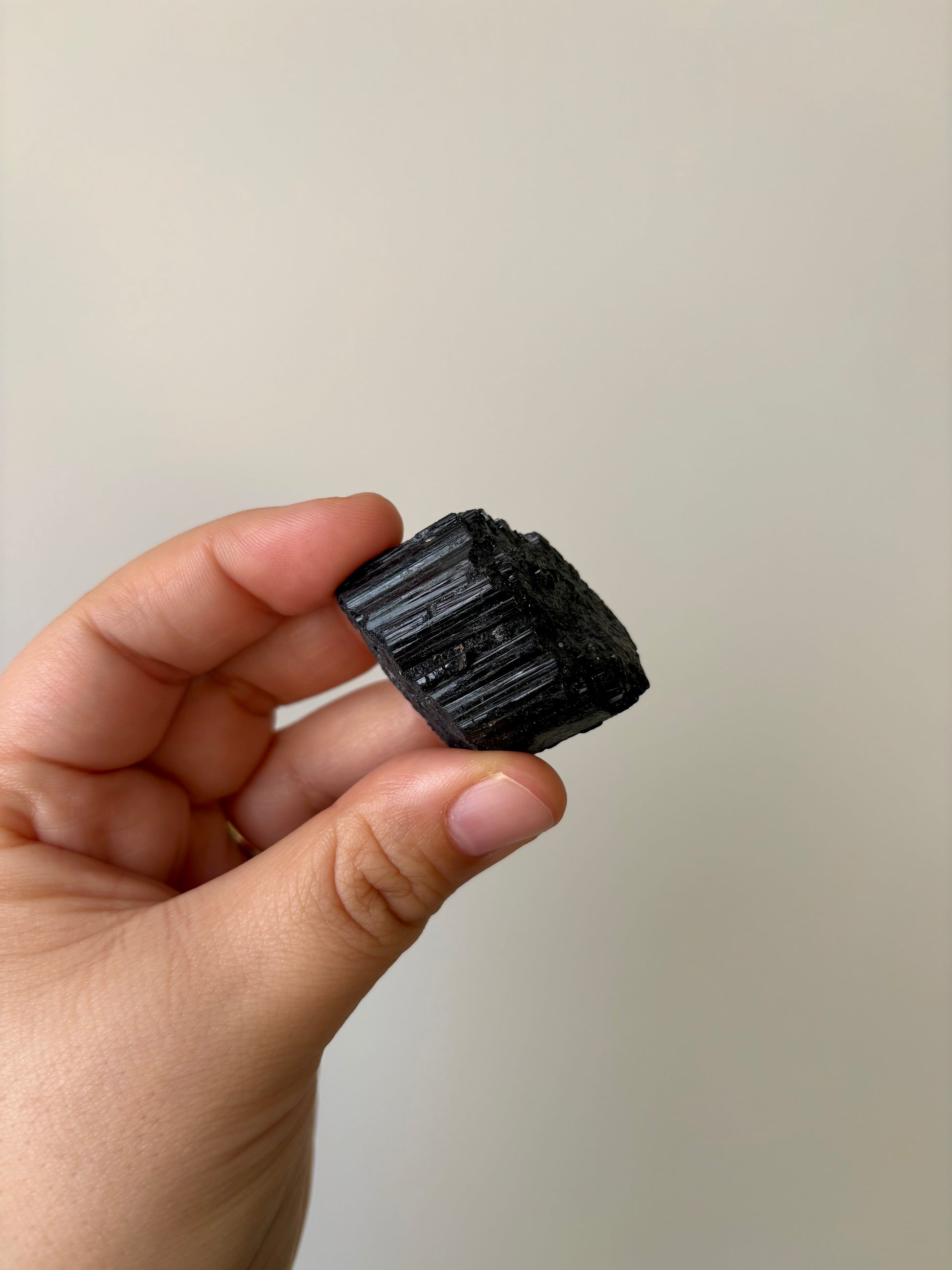 Zwarte Toermalijn is een krachtige, diepzwarte kristalsteen met een ruwe oppervlak, waardoor hij aardend en prettig in de hand ligt. Elk exemplaar is uniek en nodigt uit om vast te houden en bij je te dragen.